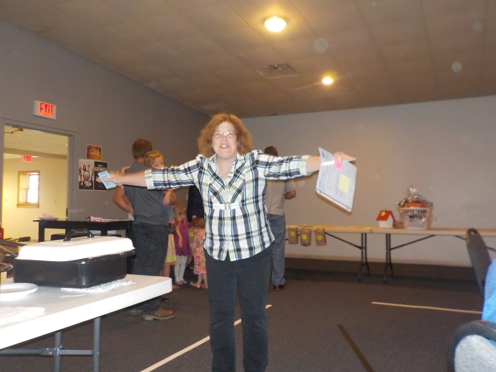 I had invited my cousin Becky and she came. We sat at a table with the Enzinna's, Peg and David, Betty and Marie. Peggy had purchased a LOT of tickets and won a LOT of items including a ride with a pilot in a small plane. Here she is pretending to fly, right after she picked up her certificate.